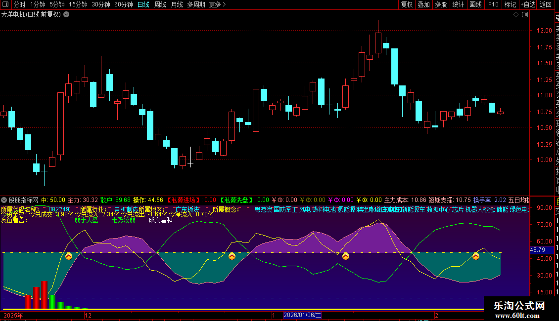 指标将趋势判断、多空力道、资金监控、多种买入信号以及基本面信息集成在一个界面。使用者可主要观察`主力`线与`散户`线的相对位置判断趋势,结合`操作`线的金叉死叉寻找买卖点,并关注`私募进场`信号和`¥①-④`等买入提示作为决策参考。界面下方的信息看板提供了快速的盘面状态和个股资料概览。