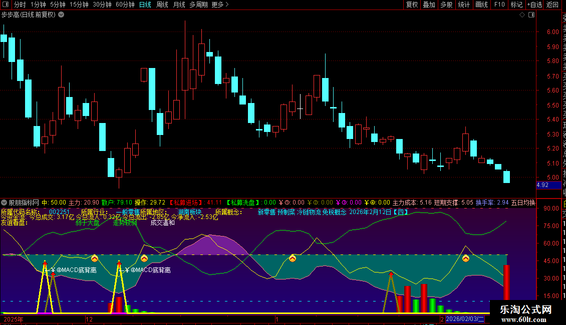 4. 多重买入信号:公式内置了多个独立的买入条件(标注为`¥①`、`¥②`、`¥③`、`¥④`),当条件满足时,会在K线图对应位置显示高亮的信号点和文字说明(如“MACD底背离”)。