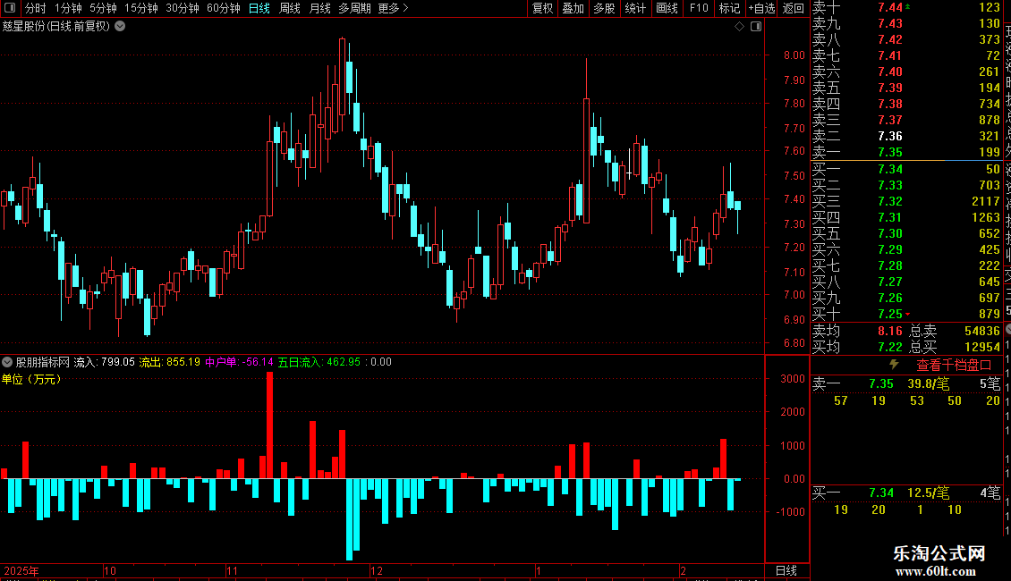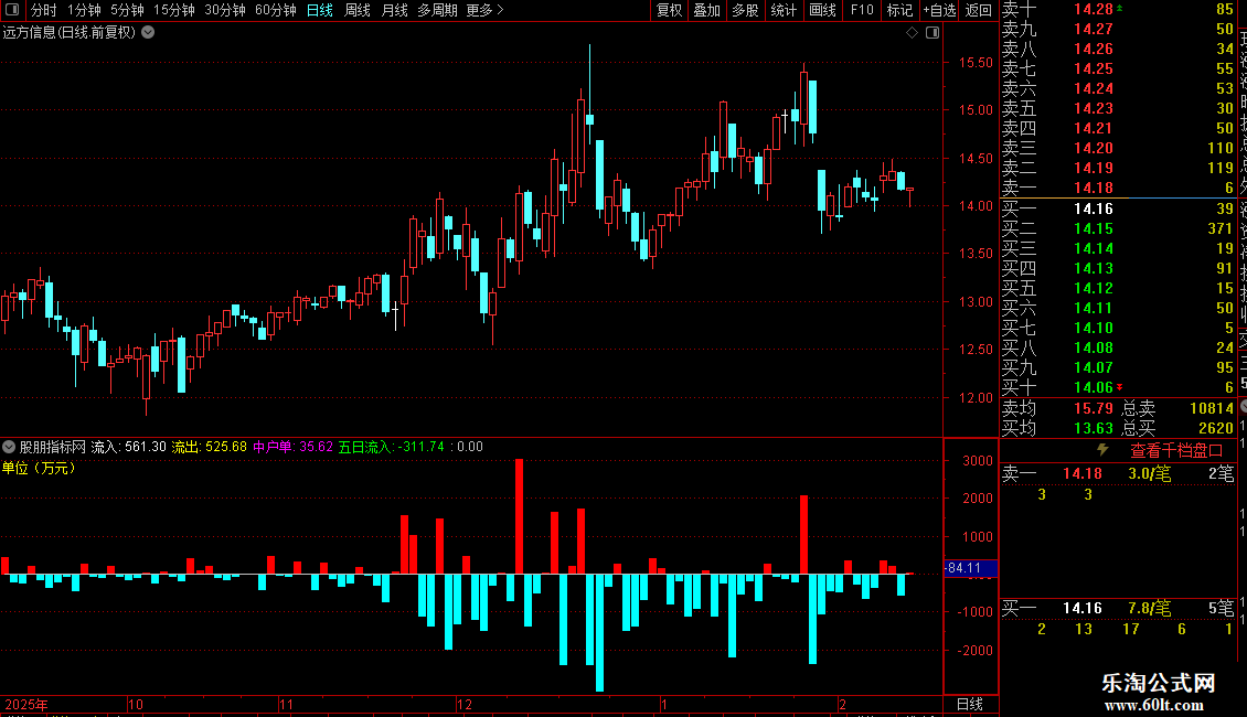 1. 资金流向:利用Level-2数据计算中户单资金净流入(万元),并以红绿柱线直观显示。