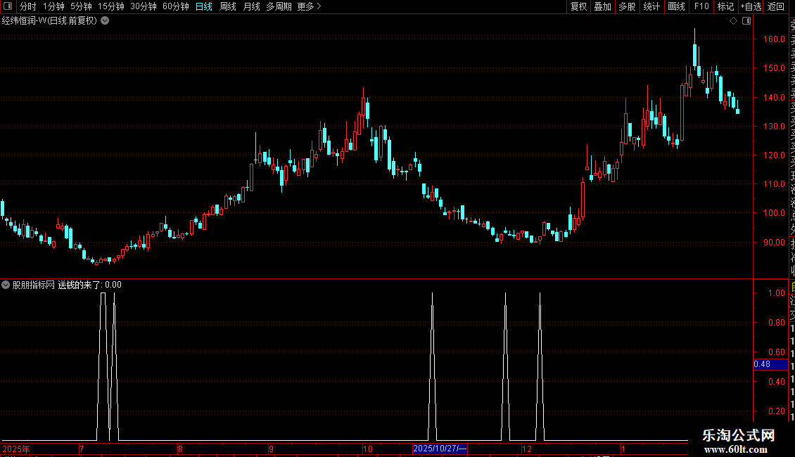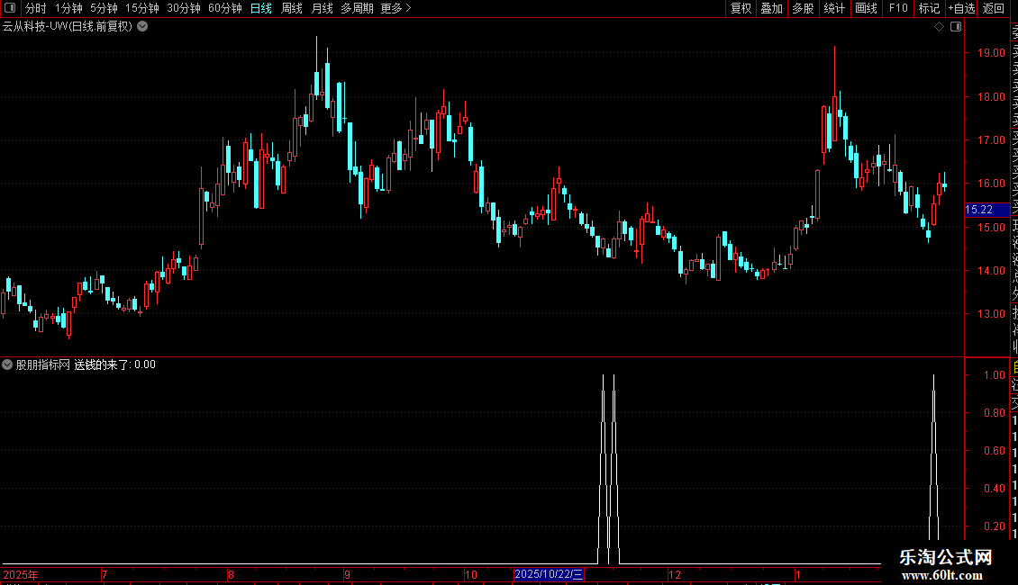 指标用于识别潜在的买入信号,命名为“送钱的来了”。它通过两组条件组合判断: