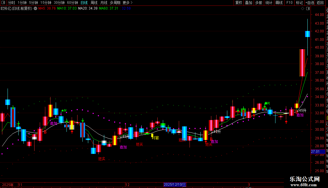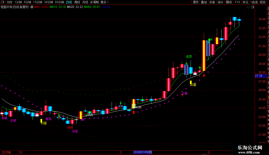 4. 买卖点提示:通过图标(如笑脸、箭头)和文字(如“买底”、“逃顶”、“立桩”、“短买”)标记多种策略产生的买入和卖出信号。
