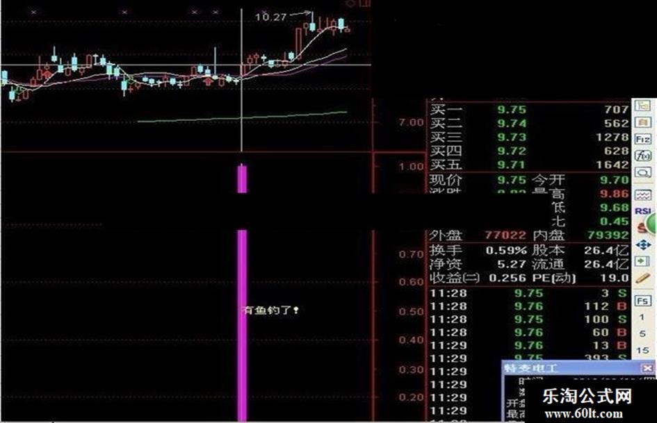 DIF:=EMA(CLOSE,12)-EMA(CLOSE,26); DEA:=EMA(DIF,9); MACD:=(DIF-DEA)*2; GG:=CROSS(DIF,0) AND CROSS(MACD,0); EE:=MA(V,6); EE1:=MA(V,36); EE2:=CROSS(EE,EE1); OO:GG AND EE2 STICK,LINETHICK8,COLORMAGENTA; DRAWTEXT(OO,0.50,'有鱼钓了!'),COLOR00FFFF;
