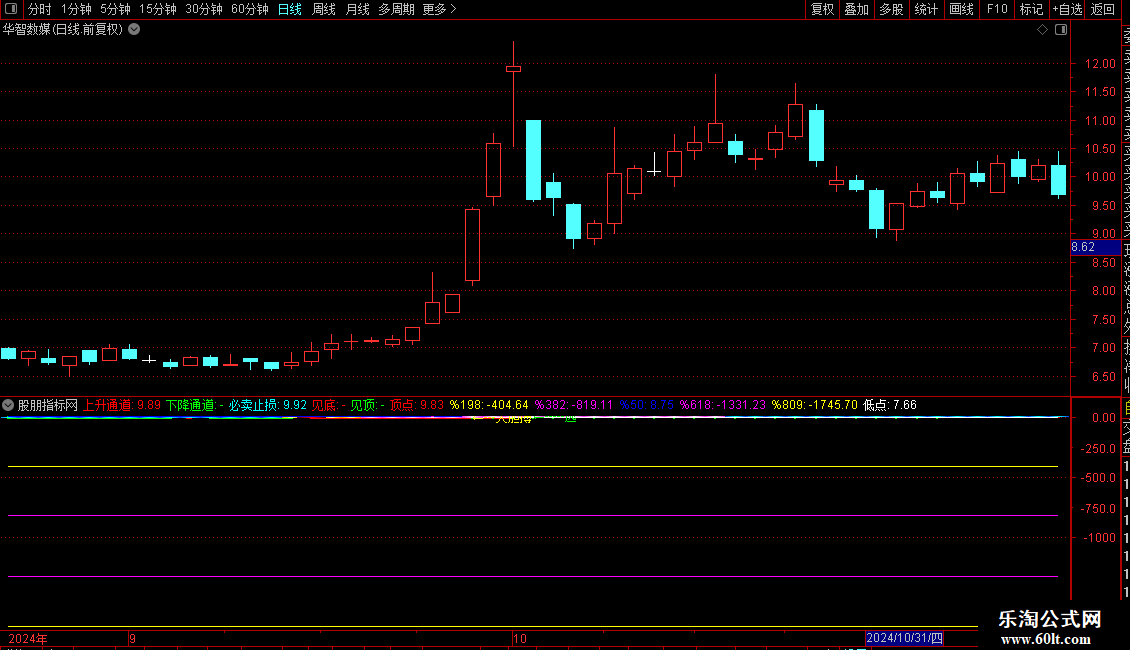下降通道(绿色粗线):当9日均线向下时显示,代表短期下降趋势。