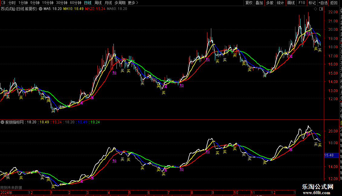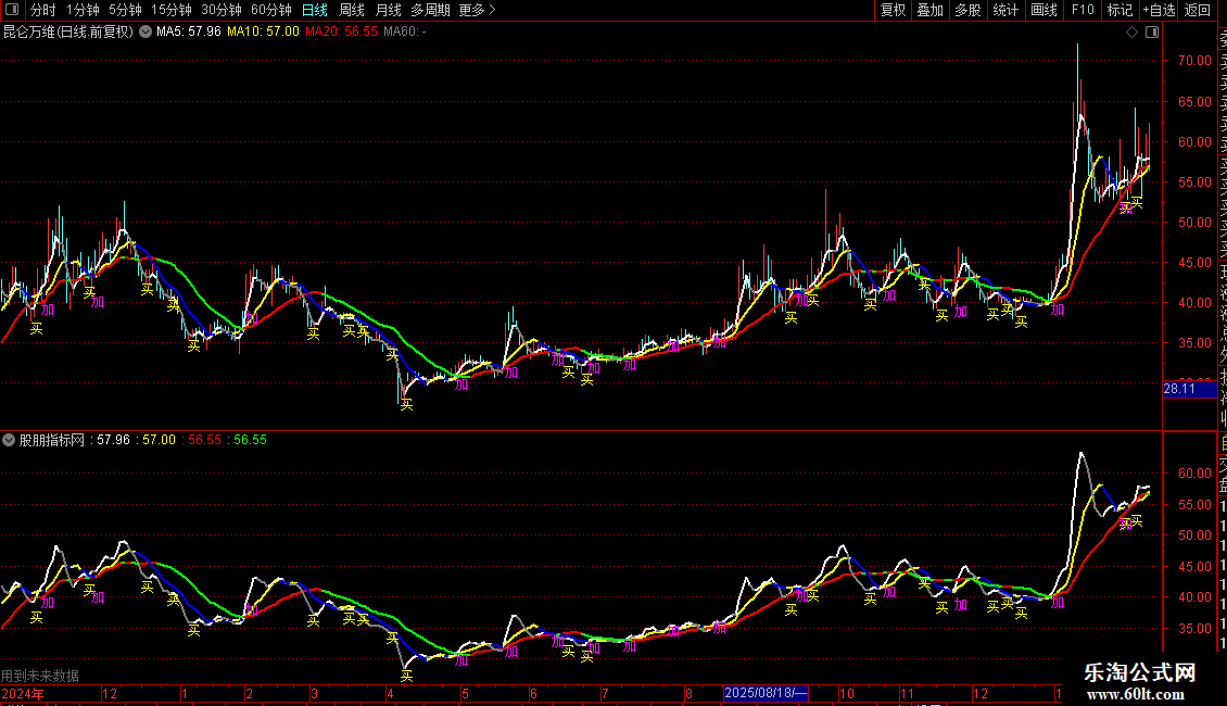 2. 当加仓信号条件成立时,在K线最低价下方2%的位置标注洋红色“加”字。