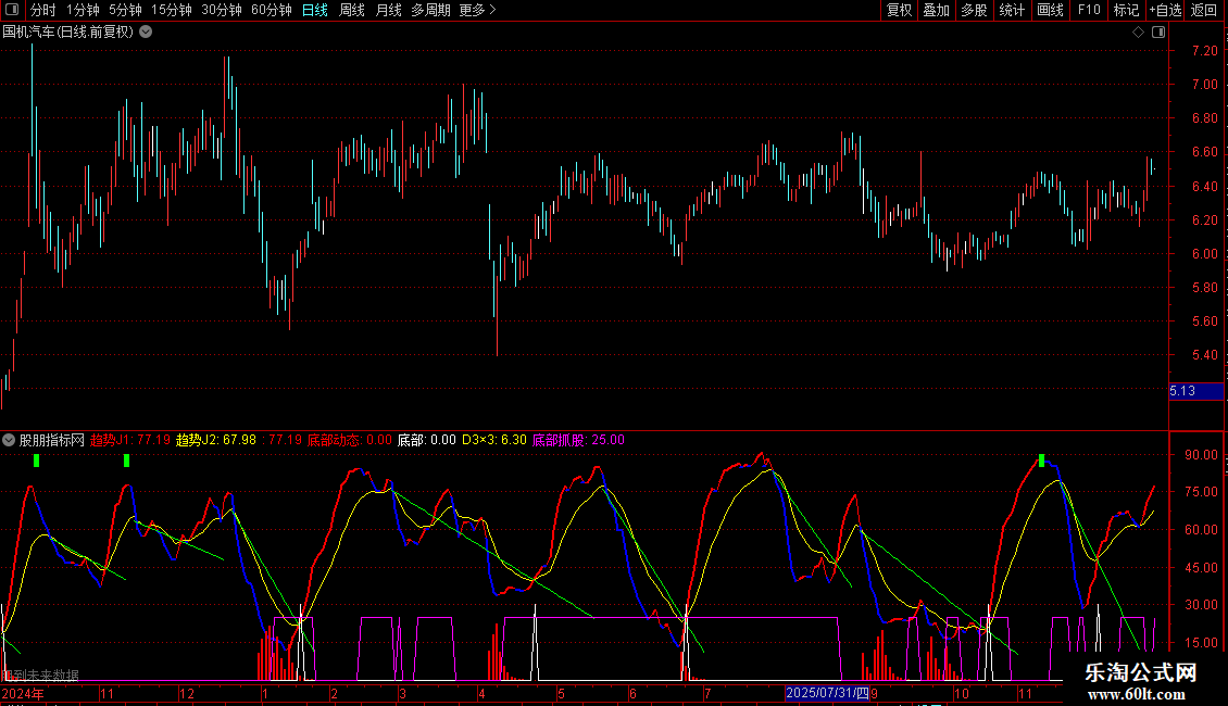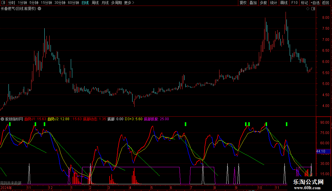 抢反弹:= IF(CROSS(K,D) AND BBIAS<-6 AND D<16 AND CLOSE>REF(CLOSE,1),80,0),COLOR00FF00;