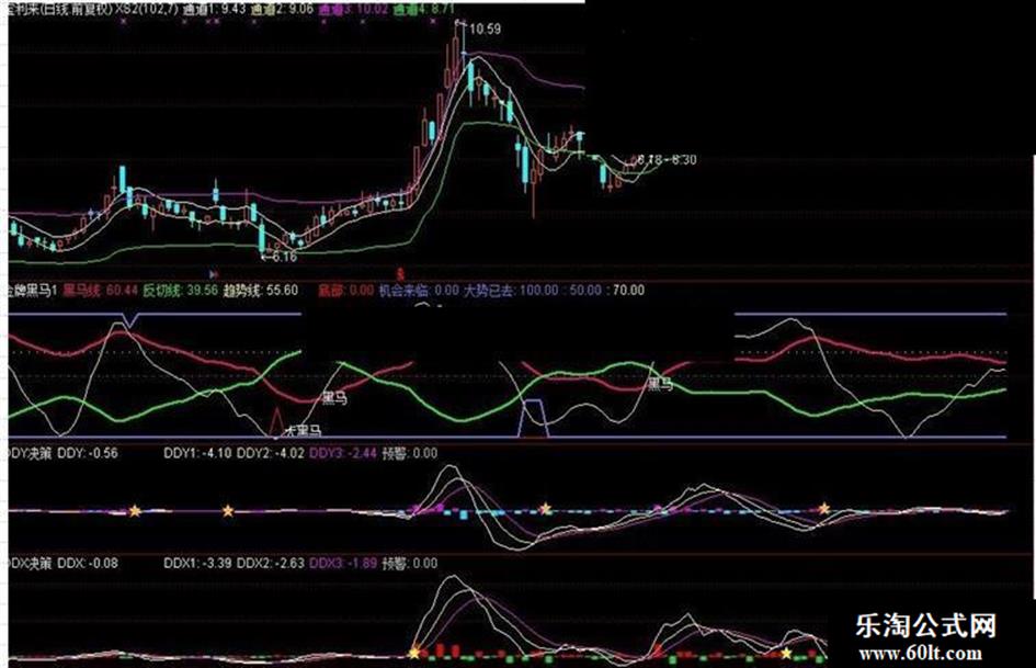 大势已去:IF(CROSS(黑马线,A1) AND 黑马线>70 AND 趋势线>80,90,100),LINETHICK2,COLORE66878;