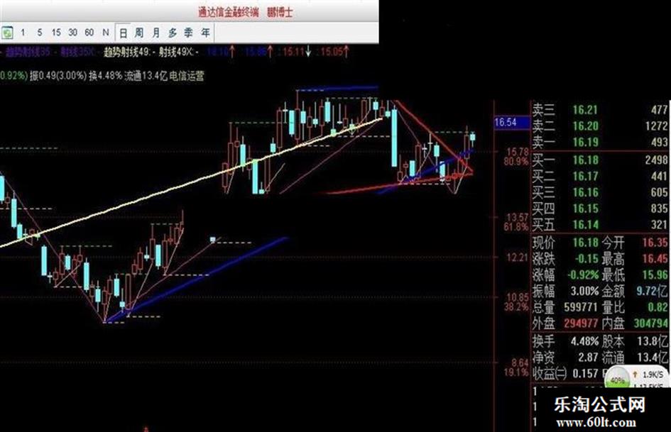 趋势射线49: DRAWLINE(H=HHV(H,49),H,L=LLV(L,49),L,0),COLORYELLOW,LINETHICK2;