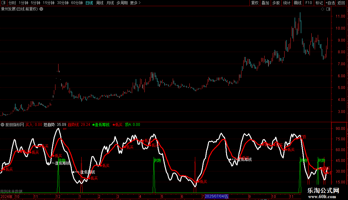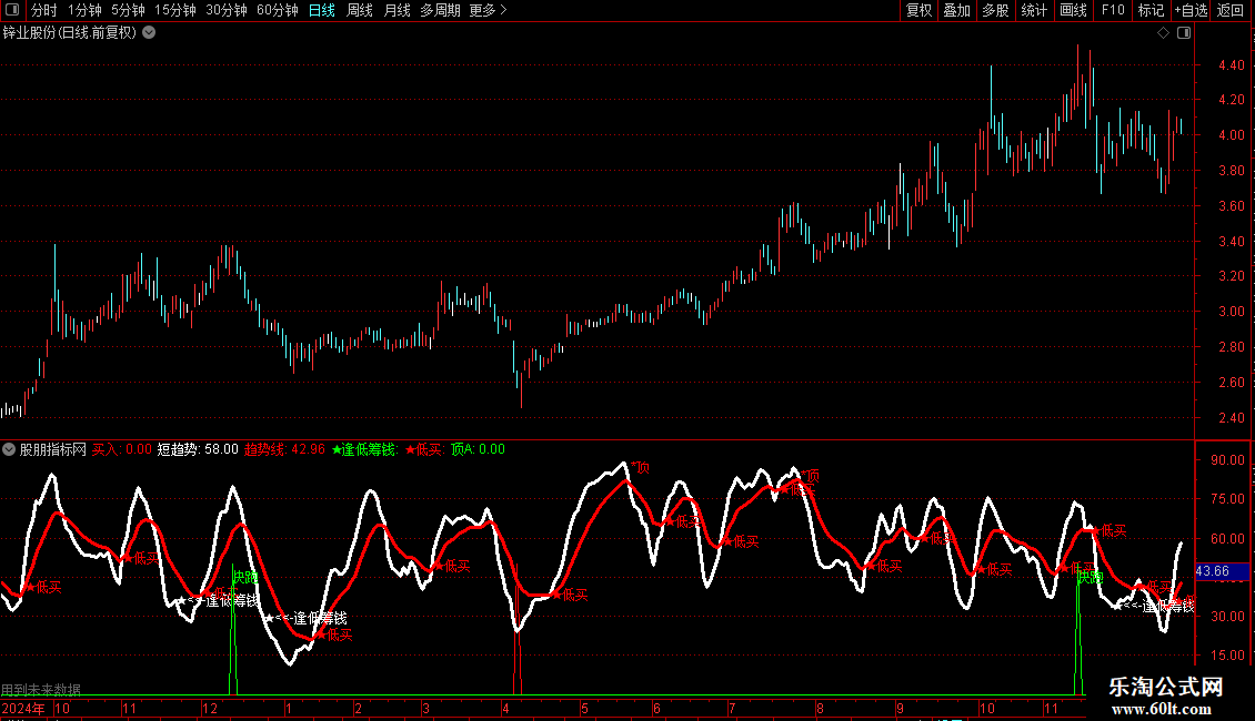 ★低买: DRAWTEXT(REF(CROSS(短趋势,趋势线),0.7) AND 短趋势>0.95*趋势线,趋势线,'★低买'),COLORRED,LINETHICK1;