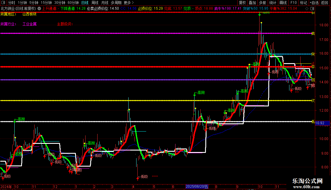 下降通道:IF(VAR11<REF(VAR11,1),VAR11,DRAWNULL),LINETHICK4,COLORGREEN;