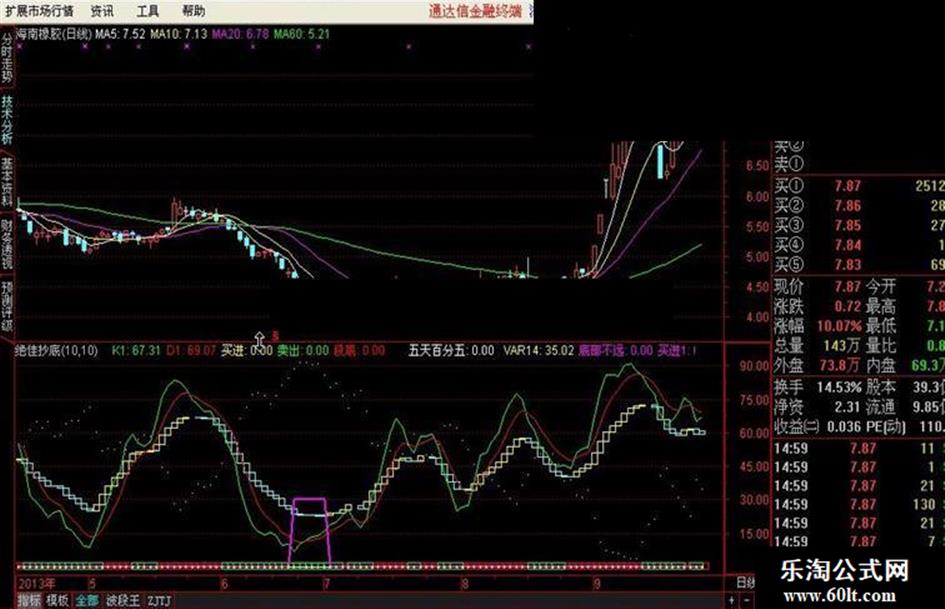 买进1:IF(CROSS(VAR13,底部不远) AND VOL>1.5*MA(VOL,5),60,0),STICK,LINETHICK3;
