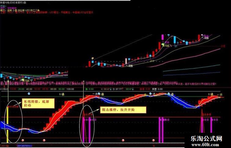 说明:只有经过长期实践和在牛、熊市中经得起时间考验的指标才是好指标,该指标无未来函数,通过K、D两条线的走势精确判断顶、底。各种买入指标的精准提示,可以成功率极高的抓到启动初期大牛股。公式简单实用,配合K线的形态和成交量一起使用会起到事半功倍的效果,此指标可能有些坛友们在我以前发其它指标的贴图中看到过,但是始终未发,指标中的各种提示还需坛友们结合下面图中的简单解释,在今后的操作使用中慢慢揣摩,必有收获……。