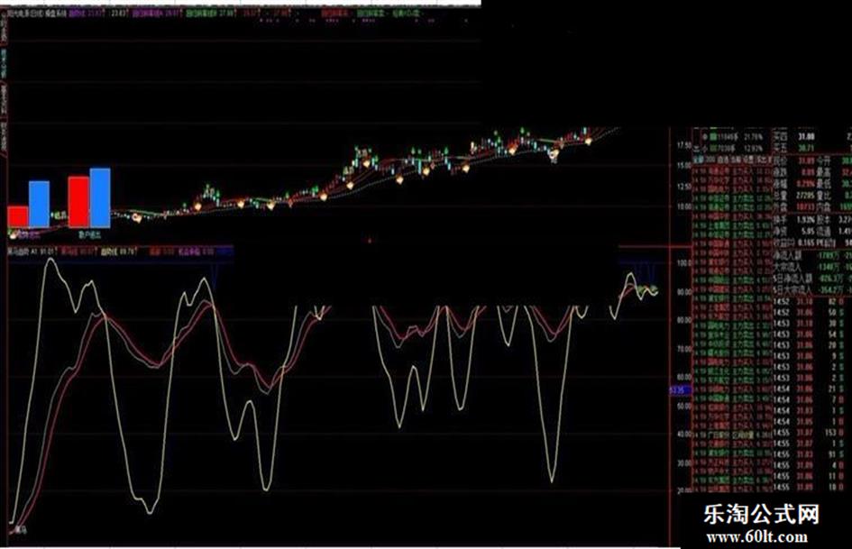 大势已去:IF(CROSS(黑马线,A1)AND 黑马线>70 AND 趋势线>80,90,100),COLORFF0000;