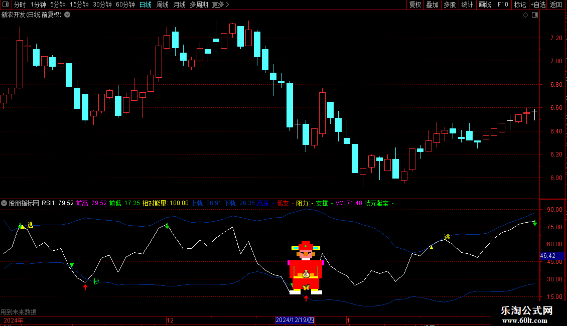 输出RSI1:收盘价-LC和0的较大值的6日[1日权重]移动平均/收盘价-LC的绝对值的6日[1日权重]移动平均*100,画白色
