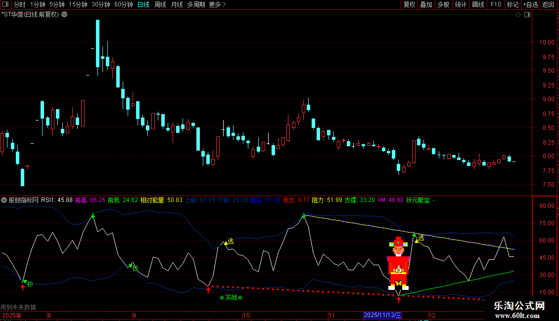 当满足条件ISLASTBARANDRSI1<1日前的RSI1时,在VM位置书写文字,COLORCCEE00
