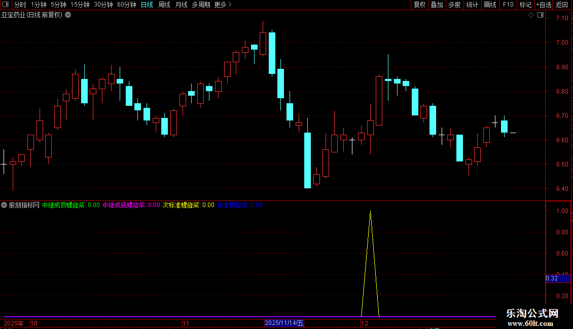 DLXJ:=(H-MAX(C,O))/(H-L)>0.2 AND (MIN(C,O)-L)/(H-L)>0.3 AND ABS(C-O)/(H-L)<0.3 AND (H-L)/O>0.04;