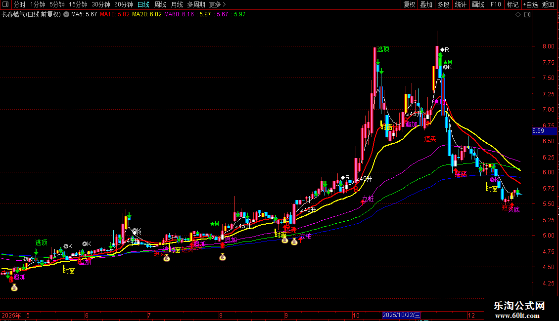 下:=EMA(中,5),COLORWHITE,LINETHICK1;