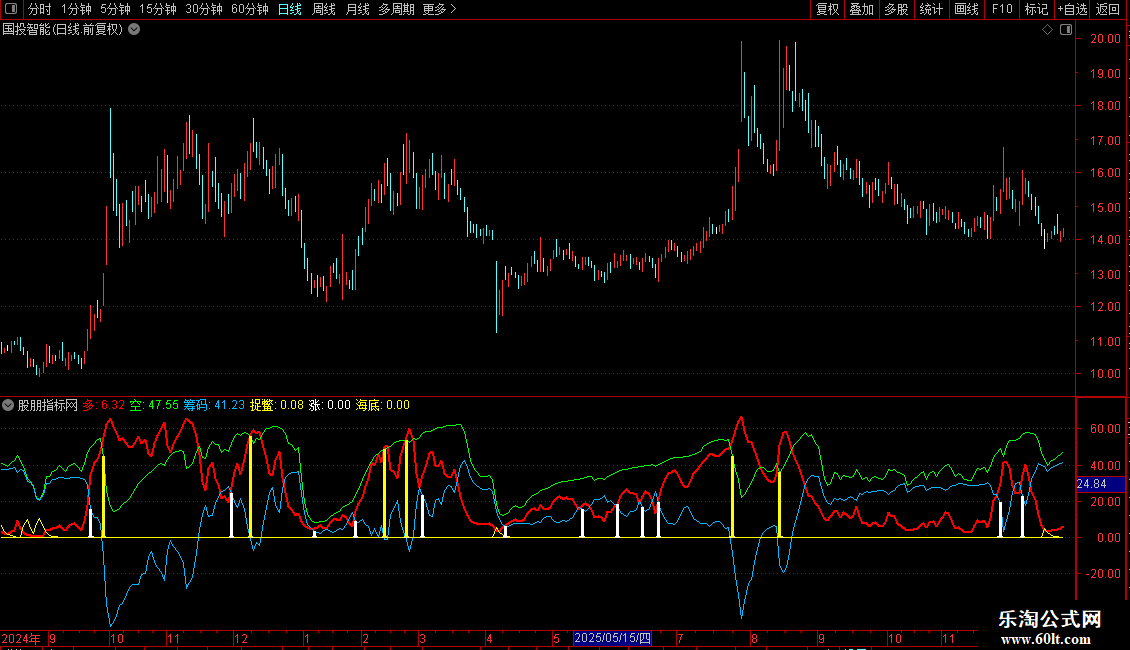 捉鳖:EMA(IF(L<= LLV(L,99),SMA(Abs(L-REF(L,1)),99,1)/SMA(MAX(L-REF(L,1),0),99,1),0)*5,3),COLORYELLOW;