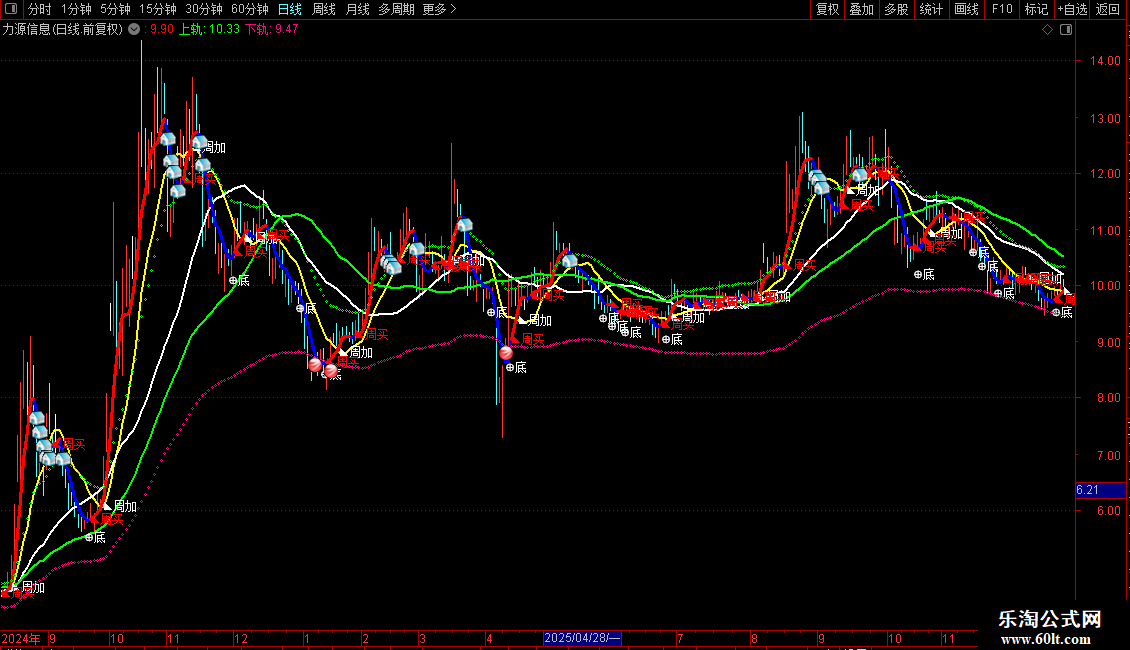 DRAWTEXT(A>=REF(A,1) AND REF(A,1)<REF(A,2),A,'◣周买'),COLORRED;{周线上买入,中期持有,月线上更好}
