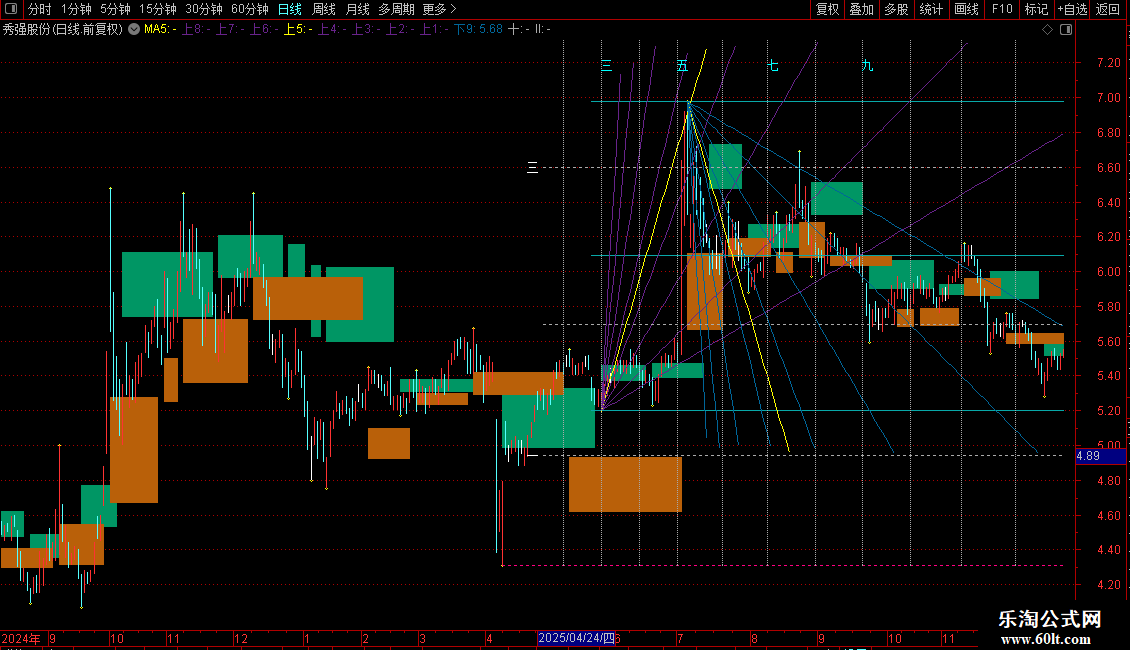 输出五:如果到最后交易的周期<=KK的最后一日取值设为常数AND五0<=高价,返回五0,否则返回无效数,DOTLINE,COLORAAAAAA