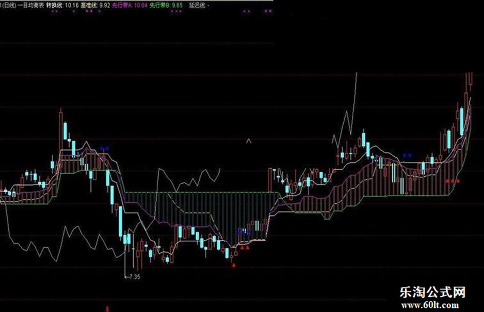 DRAWTEXT(CROSS(转换线,基准线) AND VAR1<MIN(先行带A,先行带B),MIN(基准线,LOW)*0.995,'▲'),COLORRED;