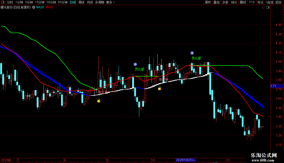 DRAWTEXT(REF(绿线,1)=REF(红线,1) AND 绿线>红线,绿线*1.02,'西北望'),COLOR00FF00;