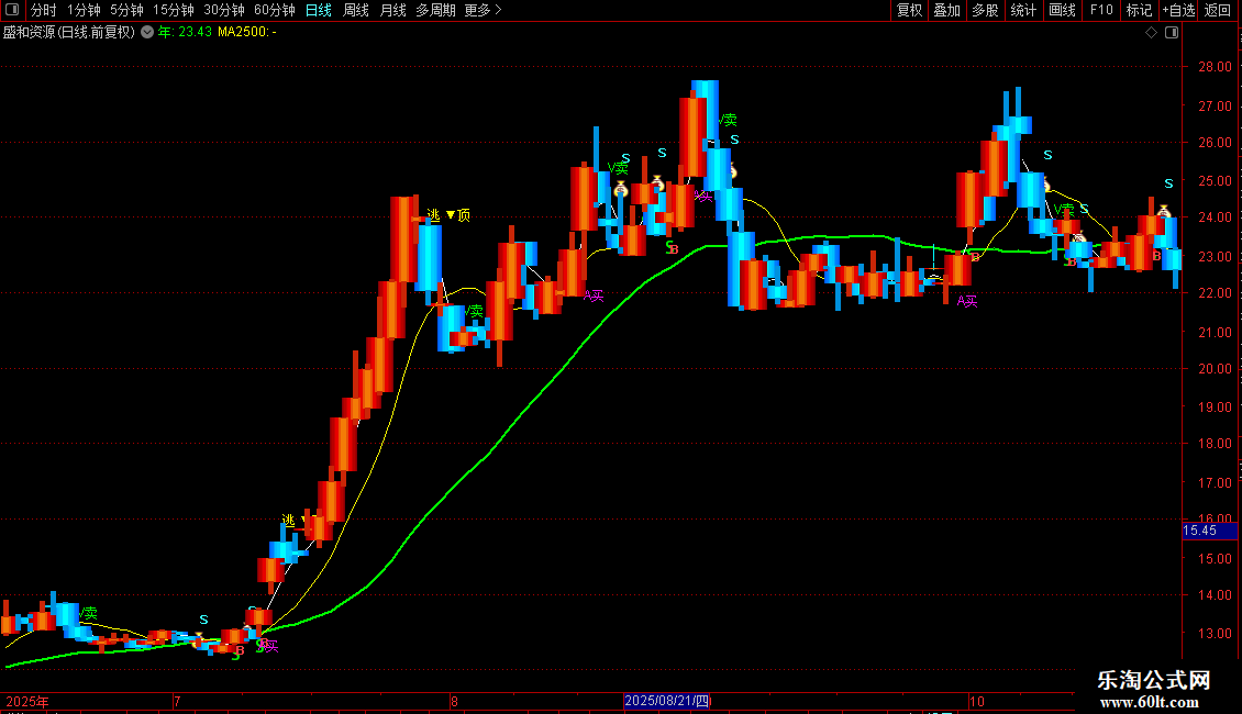 S赋值:成交量(手)的5日简单移动平均/成交量(手)的60日简单移动平均,画红色,,线宽为2