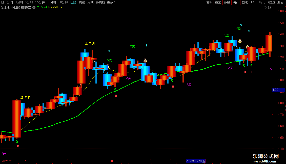 A赋值:S的5日简单移动平均,画绿色,,线宽为2