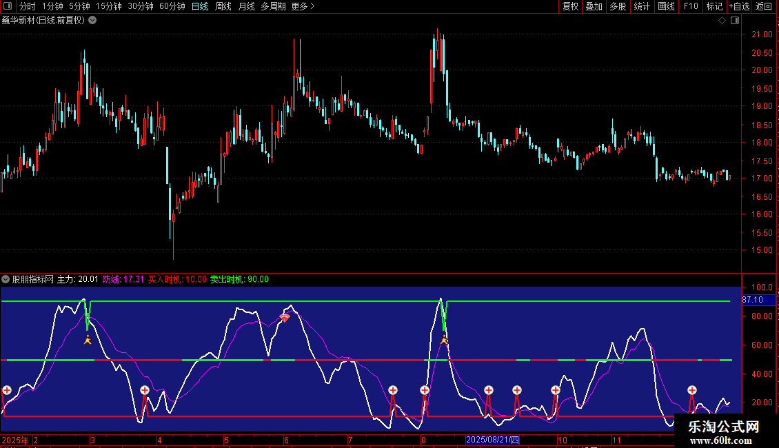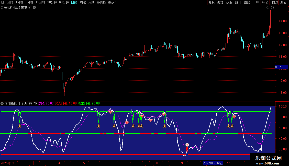 卖出时机: IF(CROSS(90,主力),70,90),LINETHICK2,COLORGREEN ;