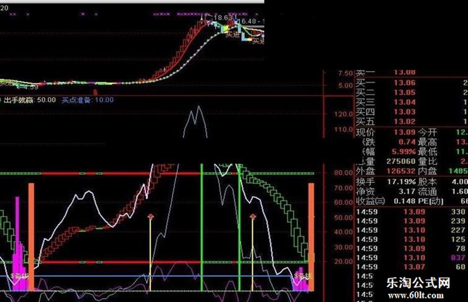 出手就赢:IF(DK1>7 AND REF(DK1,1)<0 AND (DK1-REF(DK1,1))>9,50,0),STICK,COLORYELLOW,LINETHICK2;