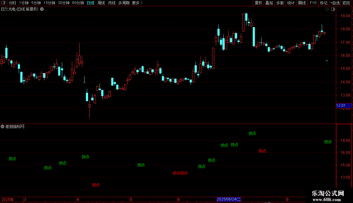 DRAWTEXT(HIGH<REF(high,1) and LOW<REF(LOW,1) and REF(HIGH,2)<REF(HIGH,1) and REF(LOW,2)<REF(LOW,1) and MA(CLOSE,5)>MA(CLOSE,10), HIGH, '拐点') ,COLOR00C800;