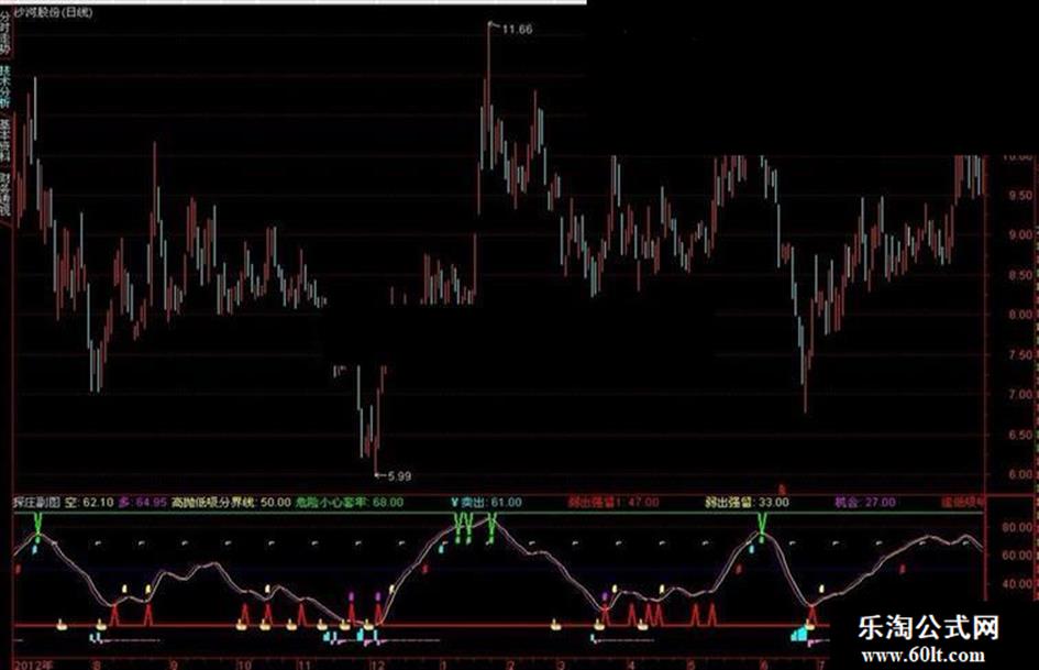 ¥卖出:IF(CROSS(空,75) AND 多<空,66,61),STICK,LINETHICK4,COLORF0F000;61,STICK,LINETHICK4,COLOR000000 ;