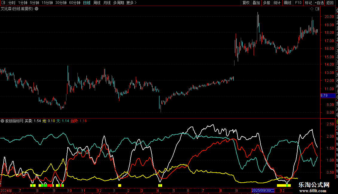 1. 买卖线:白色曲线,核心指标。数值越低,股价相对30日高点跌幅越大,超卖可能性越高;数值越高,股价越接近30日高点。通常关注其在0轴附近的转折。