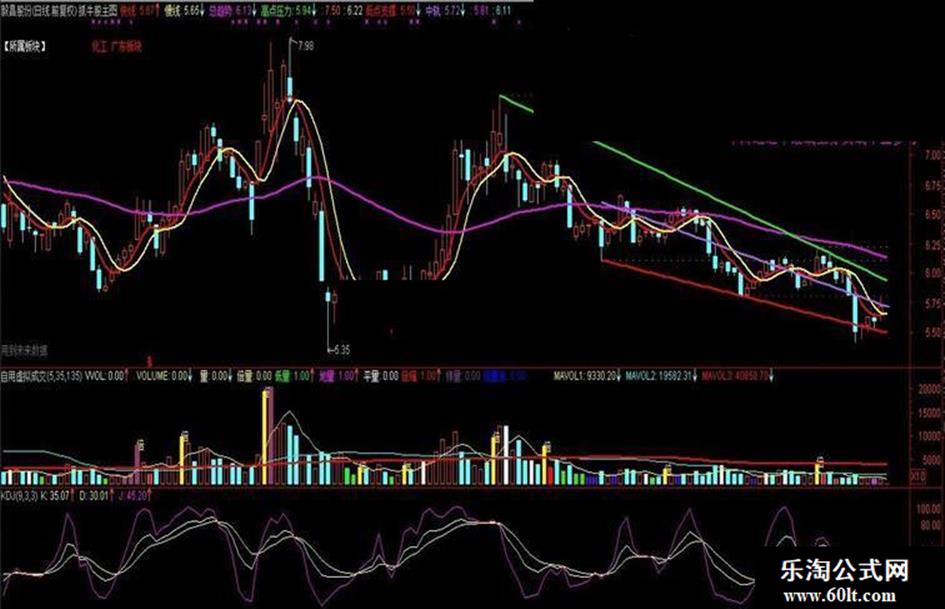 主图指标比较简单,但是很实用。只有三条线快线、慢线、趋势线和三条自动连接高低点及中轨组成。
