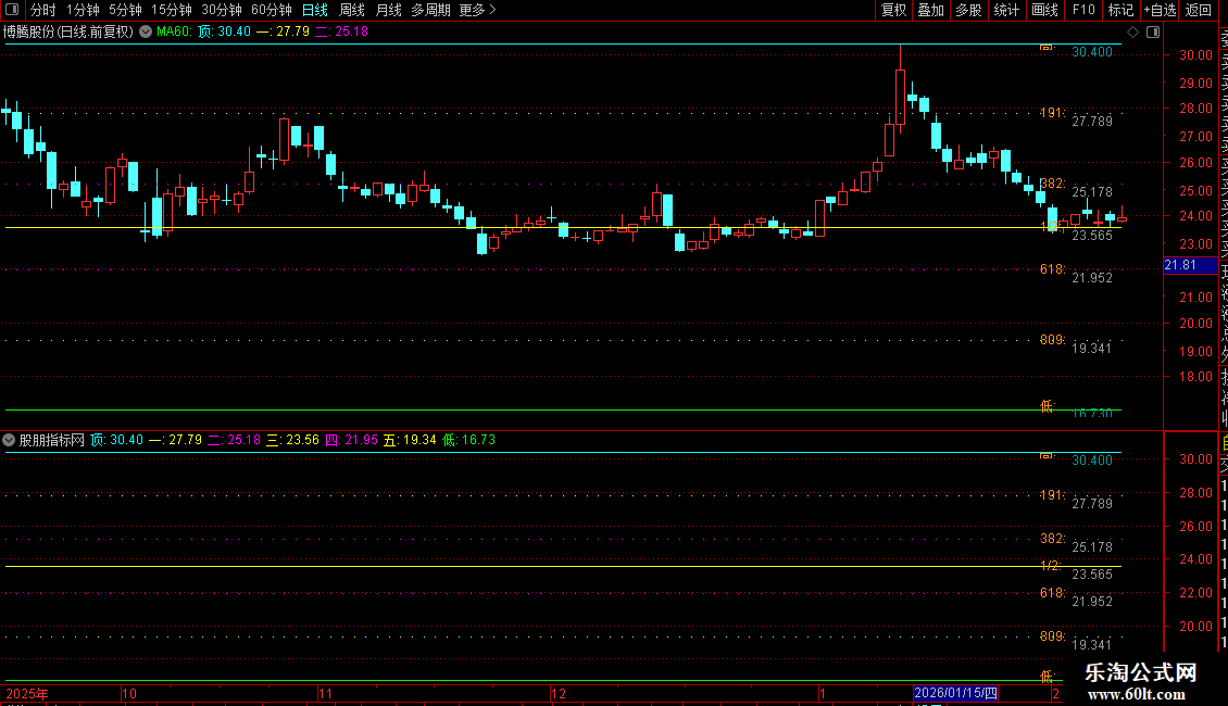 5. 黄金分割位:以150个交易日前的最高、最低价为基准,计算并绘制出该区间内的黄金分割位(0.191, 0.382, 0.5, 0.618, 0.809)以及最高、最低价水平线。这些线以不同颜色和点状线形式水平延伸,作为长期的压力与支撑参考。在K线图最左侧(约第5根K线位置)会标注这些水平线的具体数值和名称。