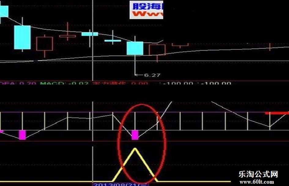如图所示,在同时出现粉红柱和黄色箭头的地方做个选股公式,
