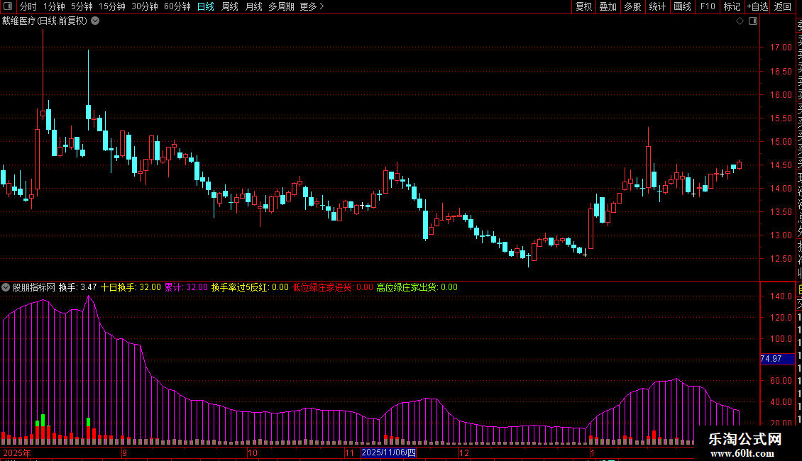 1. 换手:计算当日换手率(成交量/流通股本100),不绘制线条。
