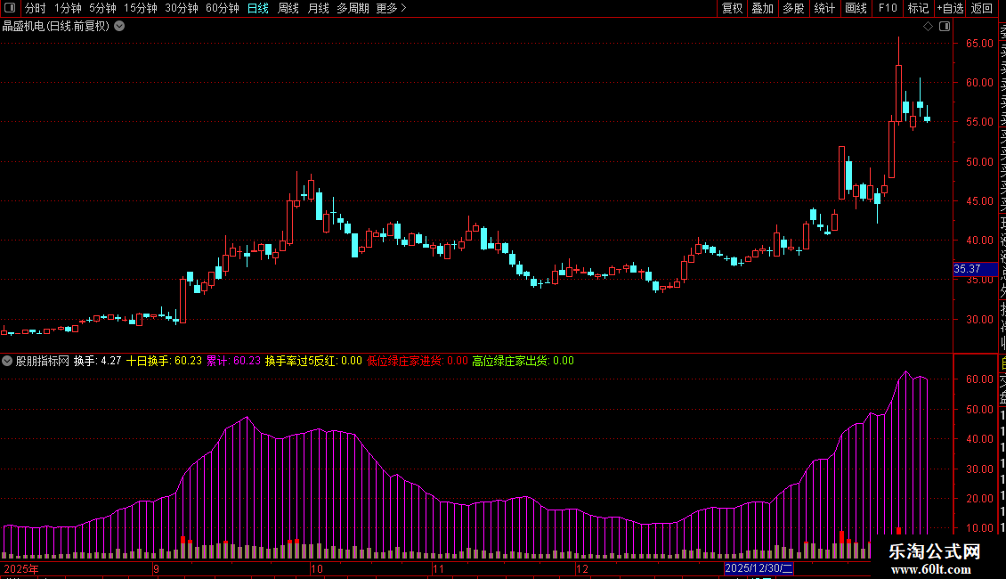 5. 高换手警示柱(红色):当单日换手率大于5%时,在5%的位置至实际换手率位置绘制红色柱状图。