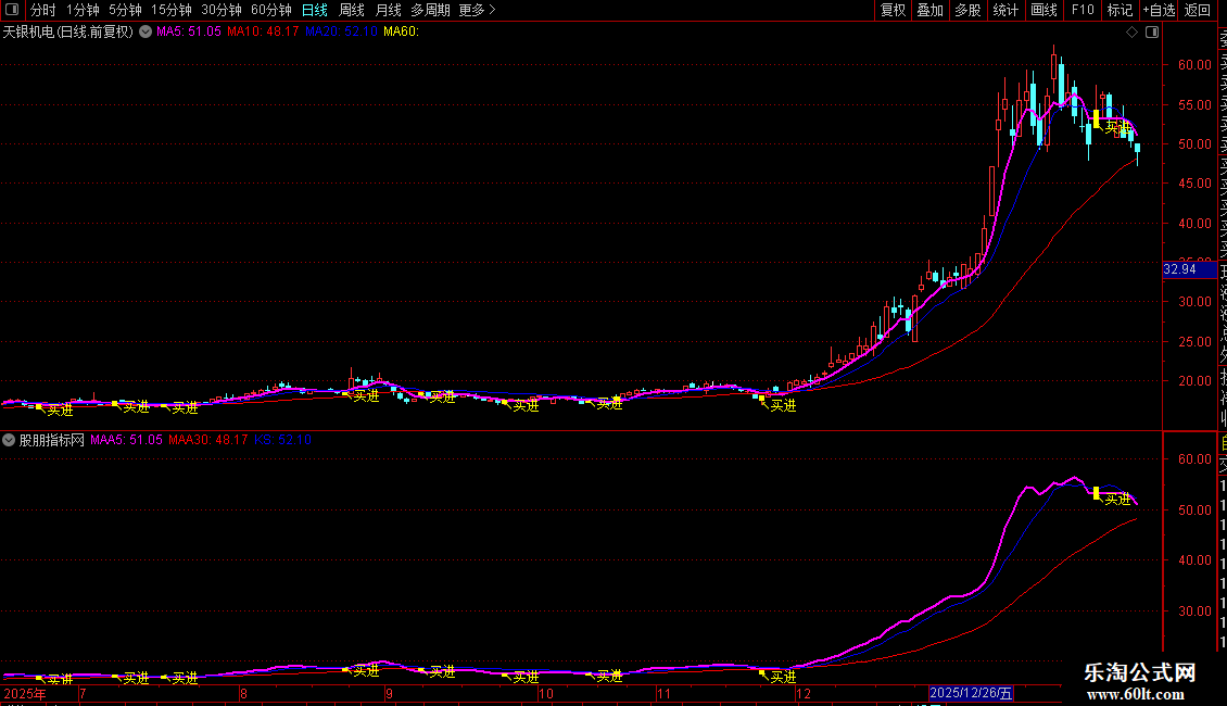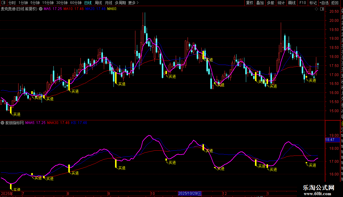 粉色粗线 (MAA5): 5日收盘价均线,代表短期趋势。线体较粗,便于观察。