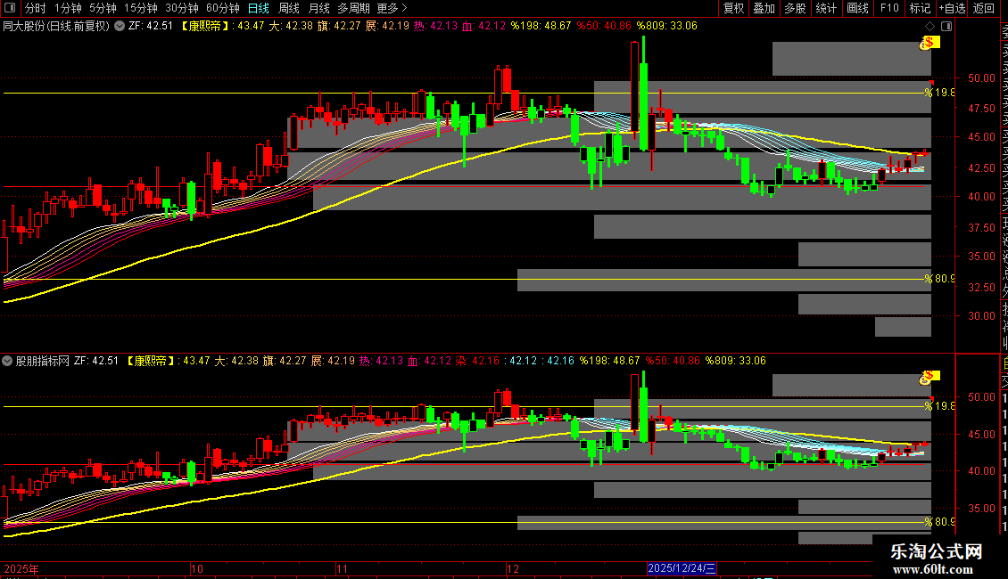 在主图叠加显示一组以“康熙帝”、“大”、“旗”、“展”、“热”、“血”、“染”命名的均线。