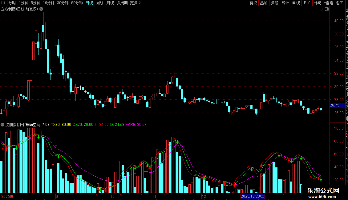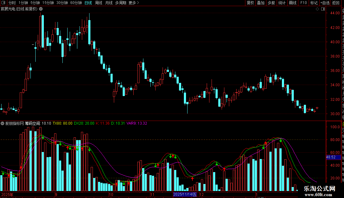 绿色箭头(买入信号):当K线从下方长时间(超过0.1个单位)上穿D线后,在K线位置标记。提示金叉买入信号。