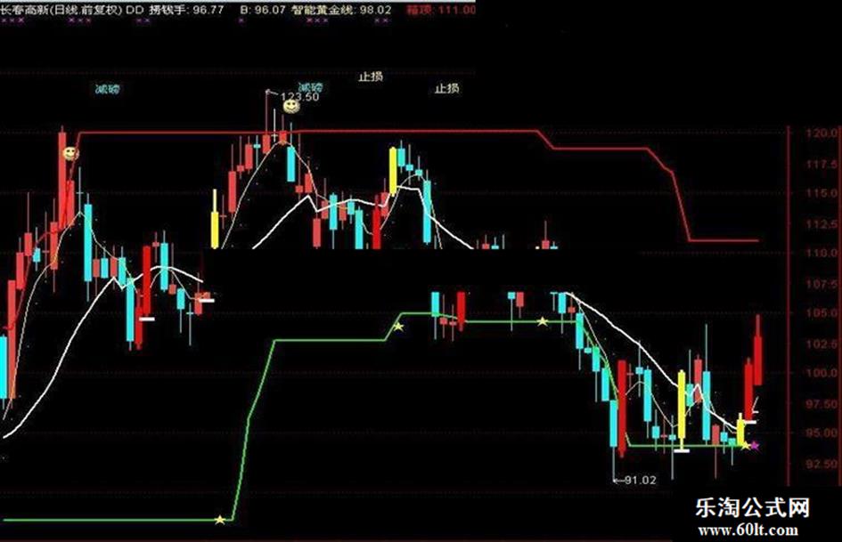 STICKLINE(买进条件 AND 捞钱手>智能黄金线 AND 智能黄金线>REF(智能黄金线,1),L,L*0.998,7,0),COLORWHITE;