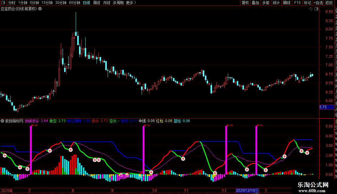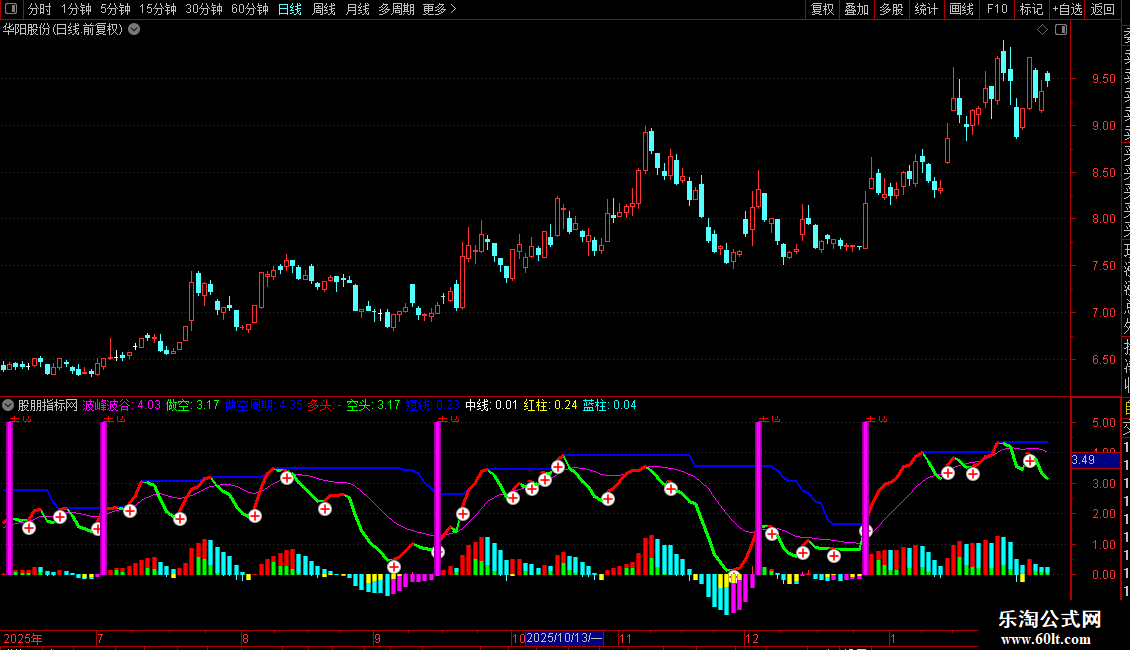 波峰波谷线(粉色): 核心趋势线,反映价格的中期波动节奏。其方向代表主要趋势。
