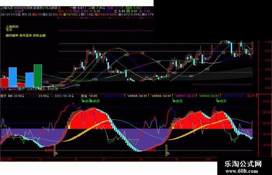 拉升:=IF(CROSS(VARC,生命) AND VARC>VARD AND VARC<55 AND C>O,9,0),STICK,COLORRED,LINETHICK2;