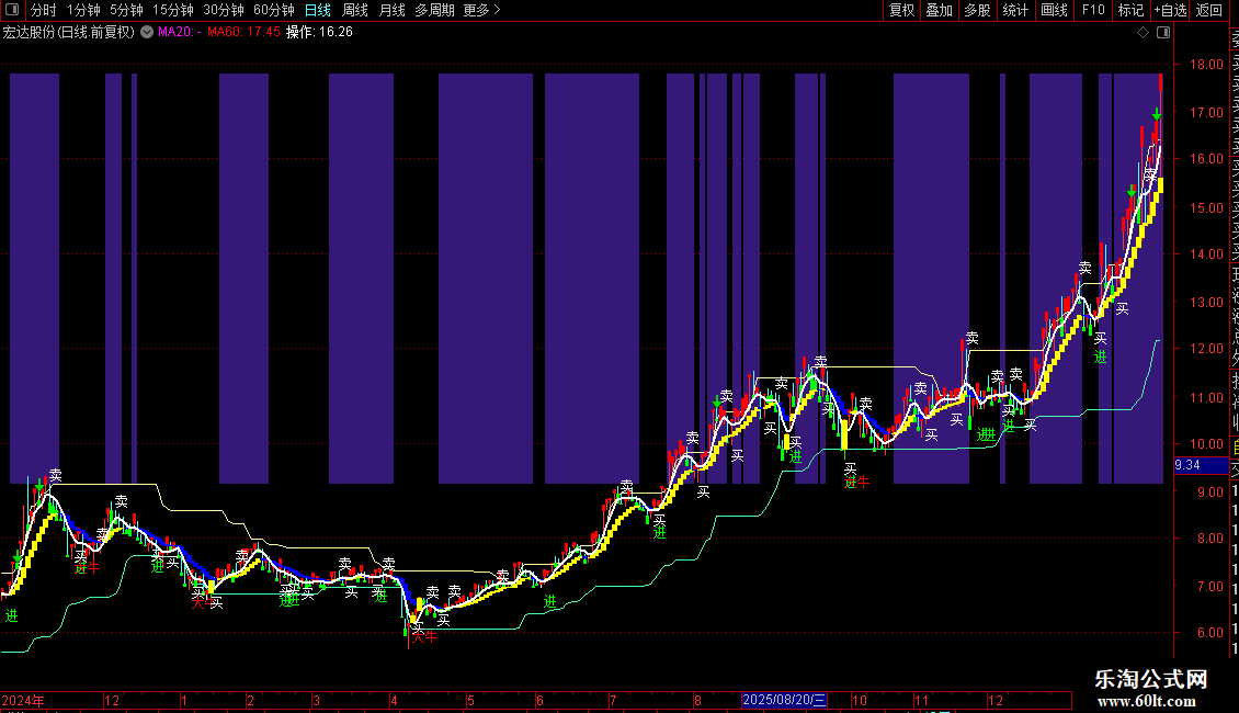 “大牛”(红色):当短期均线差极度超跌后出现金叉时,在低价位提示。