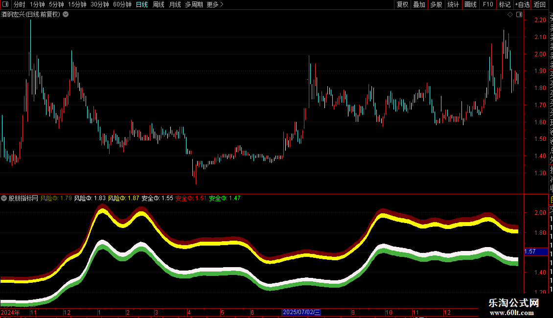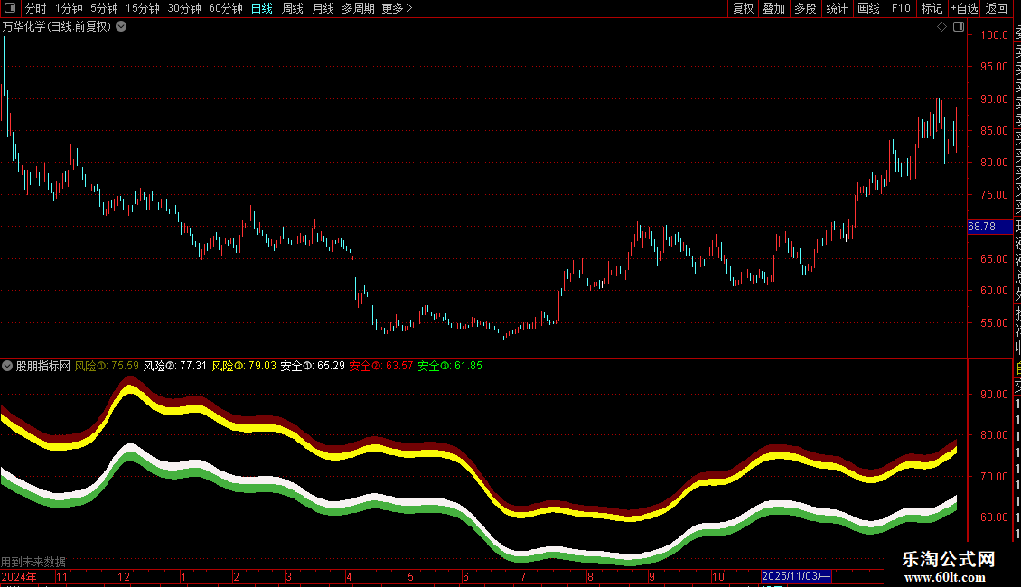 3. 风险与安全区域:以 `运动趋势` 线为基准,上下按固定百分比扩展出六个阈值,形成三个风险带和三个安全带。