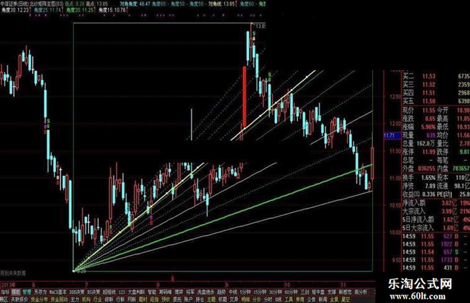 角度60:IF(TS>=0 AND 低点+(差60度/天数横线)*TS<=高点,低点+(差60度/天数横线)*TS,DRAWNULL),COLORLIBLUE,DOTLINE;