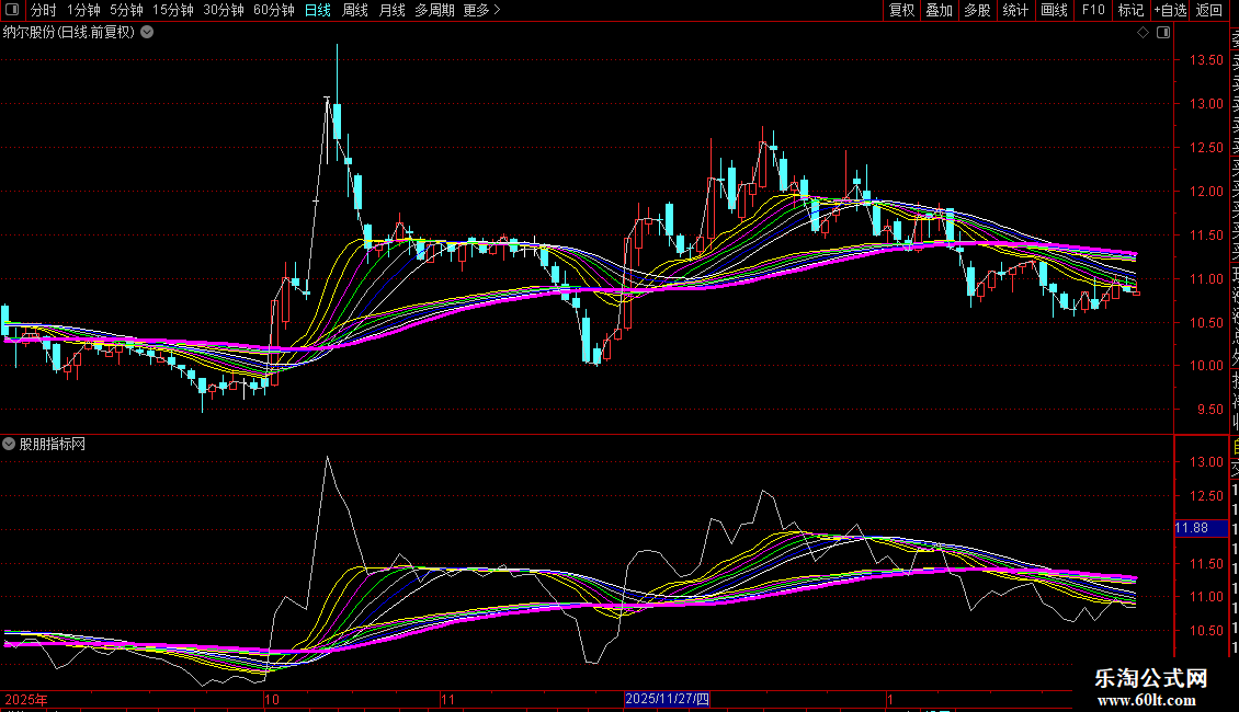 NOTEXT14(EMA60的13周期均线)为品红色粗线。