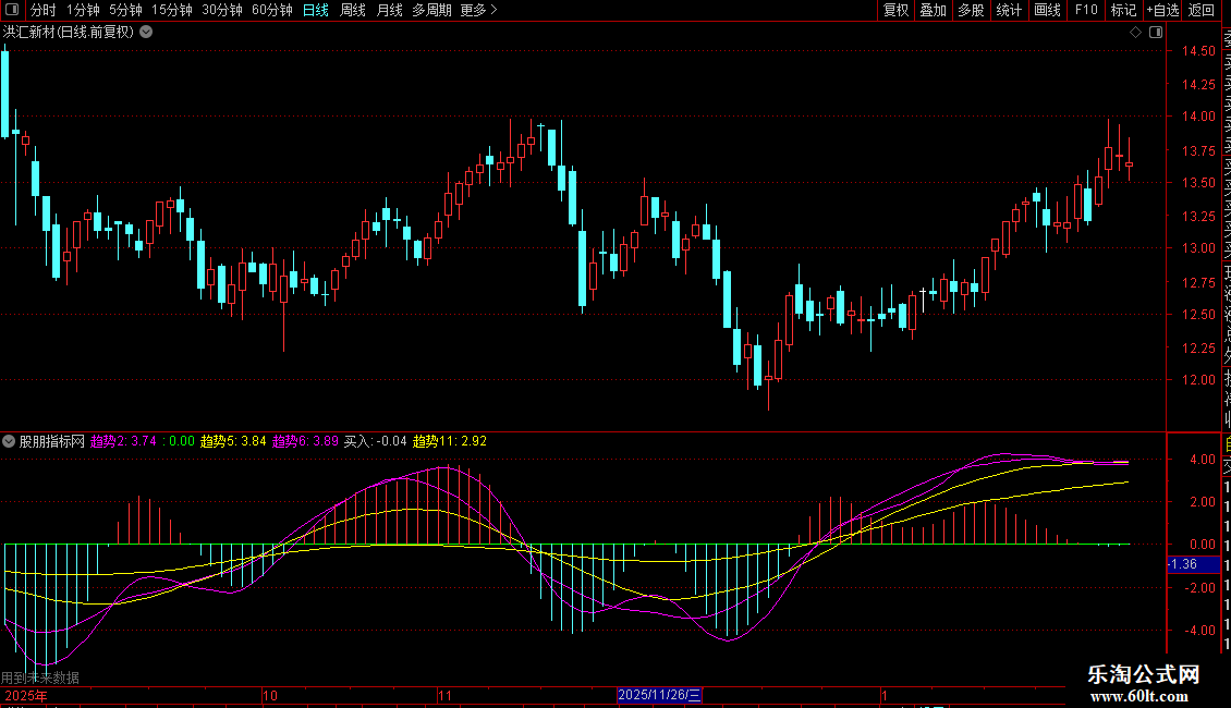 4. 趋势2(洋红色线):对13周期涨跌幅度进行三重XMA平滑,反应中短期趋势。
