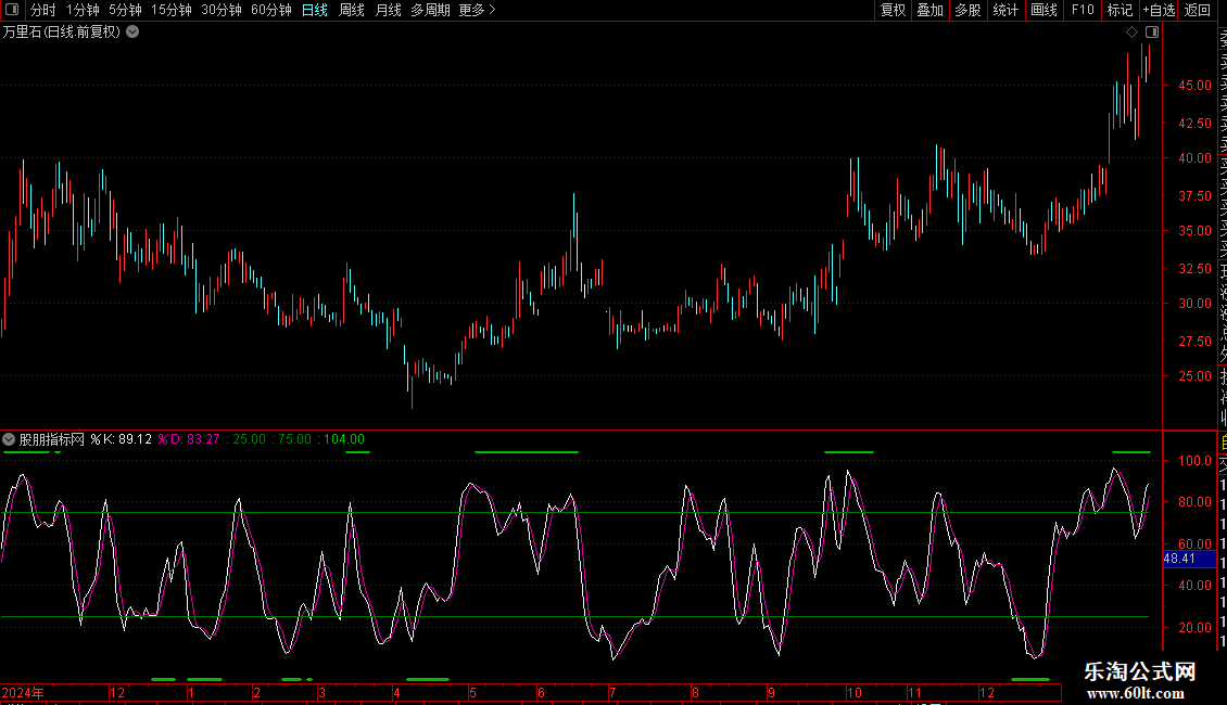 指标不仅提供KDJ和MACD的基础信号,其独特价值在于通过MACD的DIF线突破其DEA的长期波动通道(UP/DN)来捕捉潜在的趋势启动或极端转折点。绿色粗信号线出现的位置(顶部或底部)直观地提示了这些关键时机。