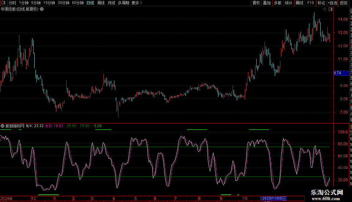 在坐标轴上绘制了Y1(25) 和Y2(75) 两条水平参考线,用于标识超卖和超买区域。